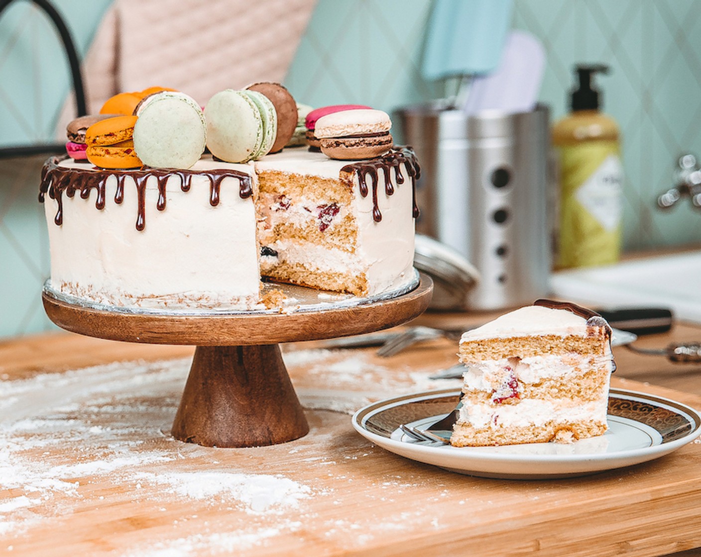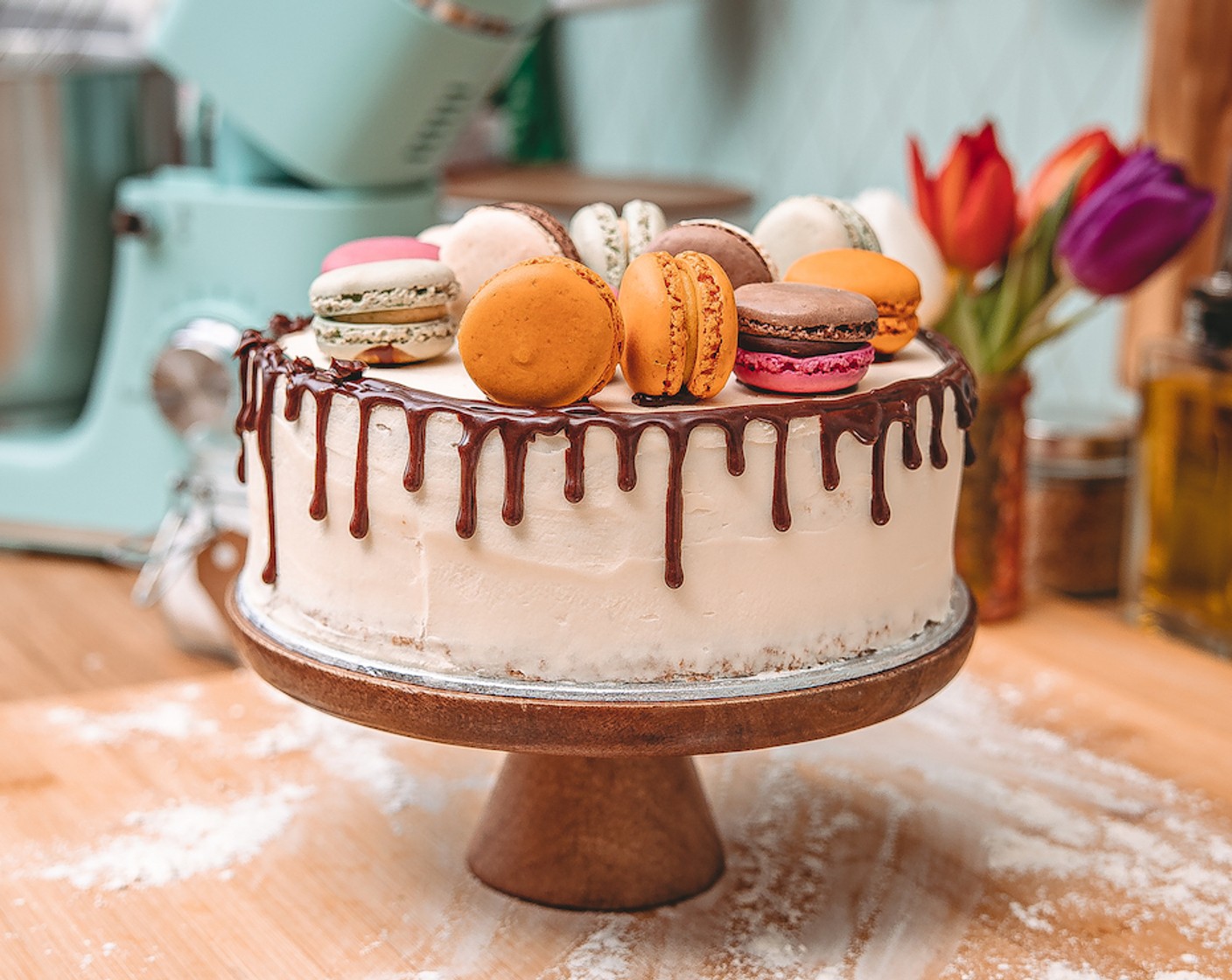 Zu guter Letzt die Torte mit den Macarons (8) verzieren.