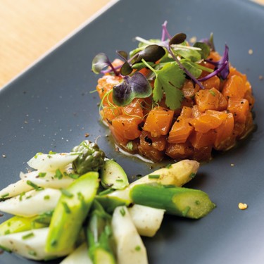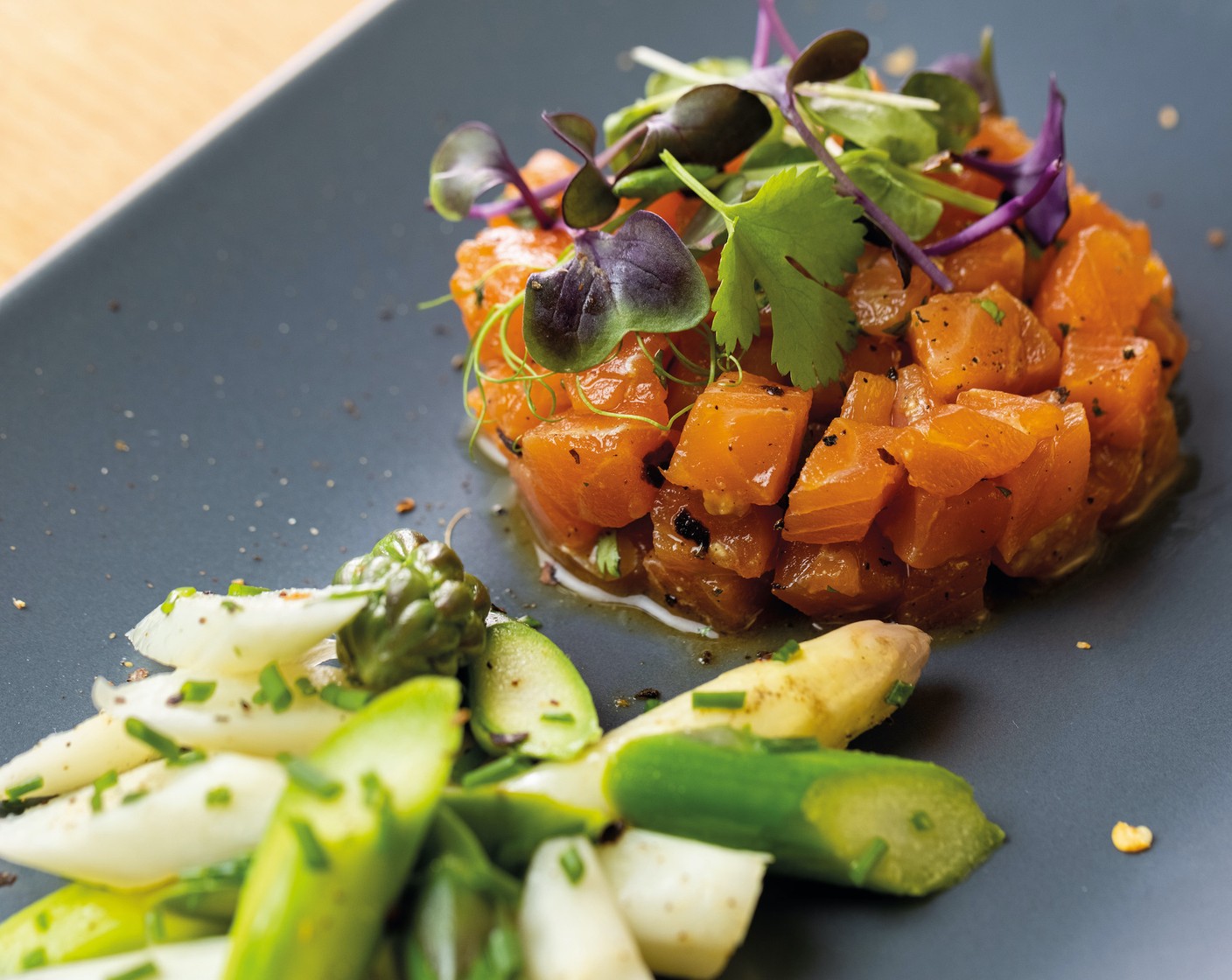 Dieses Lachstatar mit asiatischer Note ergänzt den Spargelsalat mit einfachem Dressing wunderbar.
