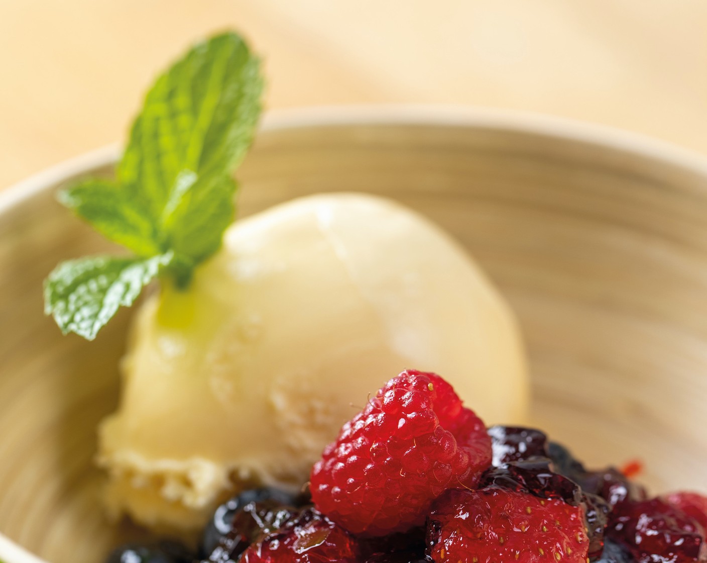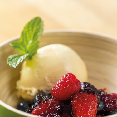 Beeren in Hagebuttengelee mit Sauerrahm.