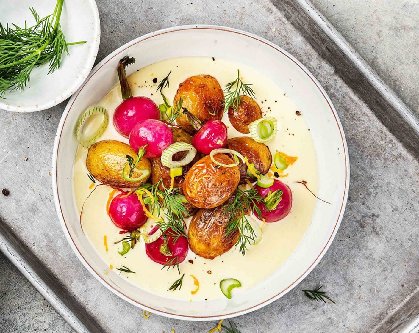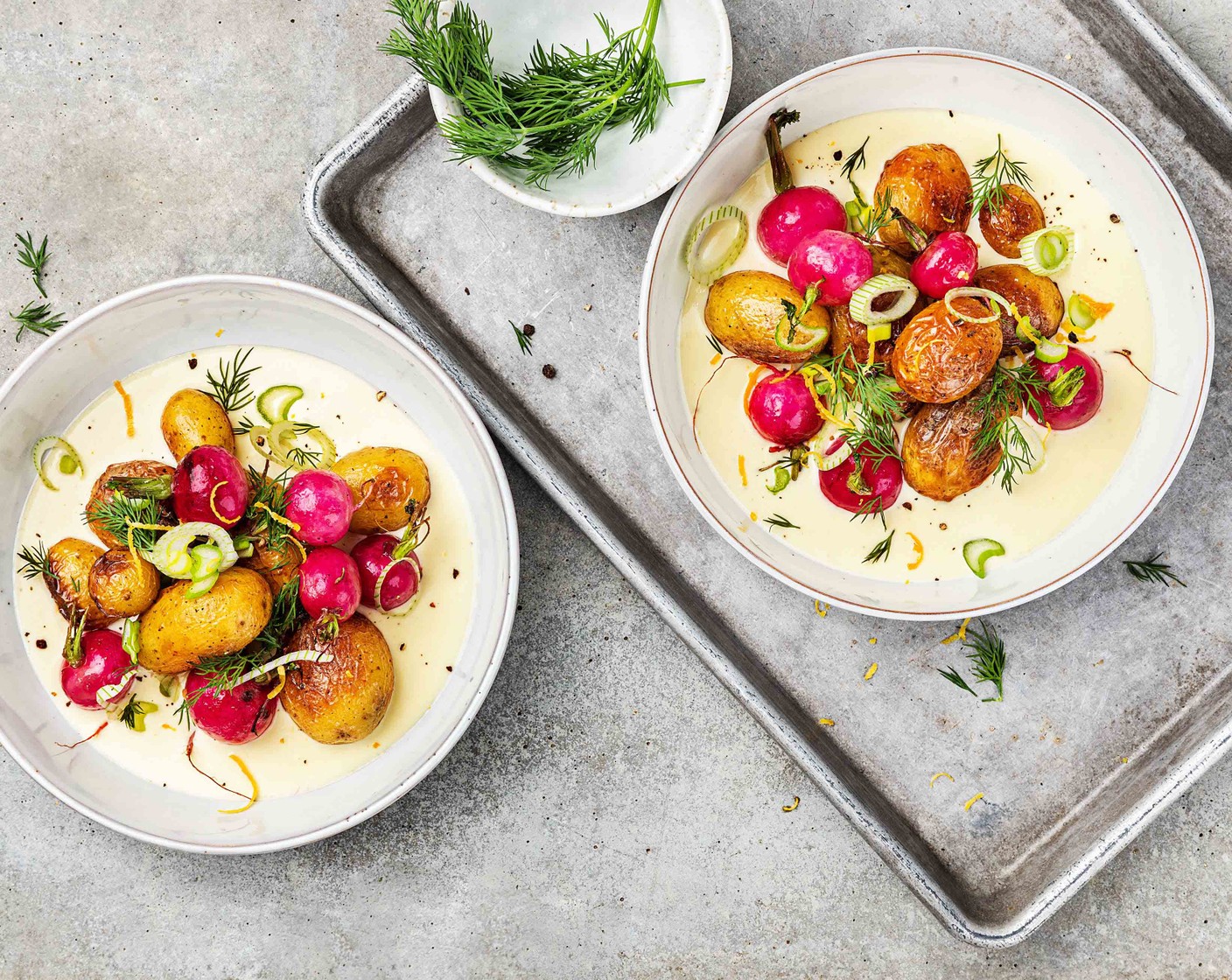 Frühkartoffeln mit Radieschen auf Fetacrème