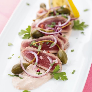 Eine ideale Alternative zum klassischen Vitello Tonnato und mit den würzigen Kapernäpfeln eine wahre Geschmacksexplosion.