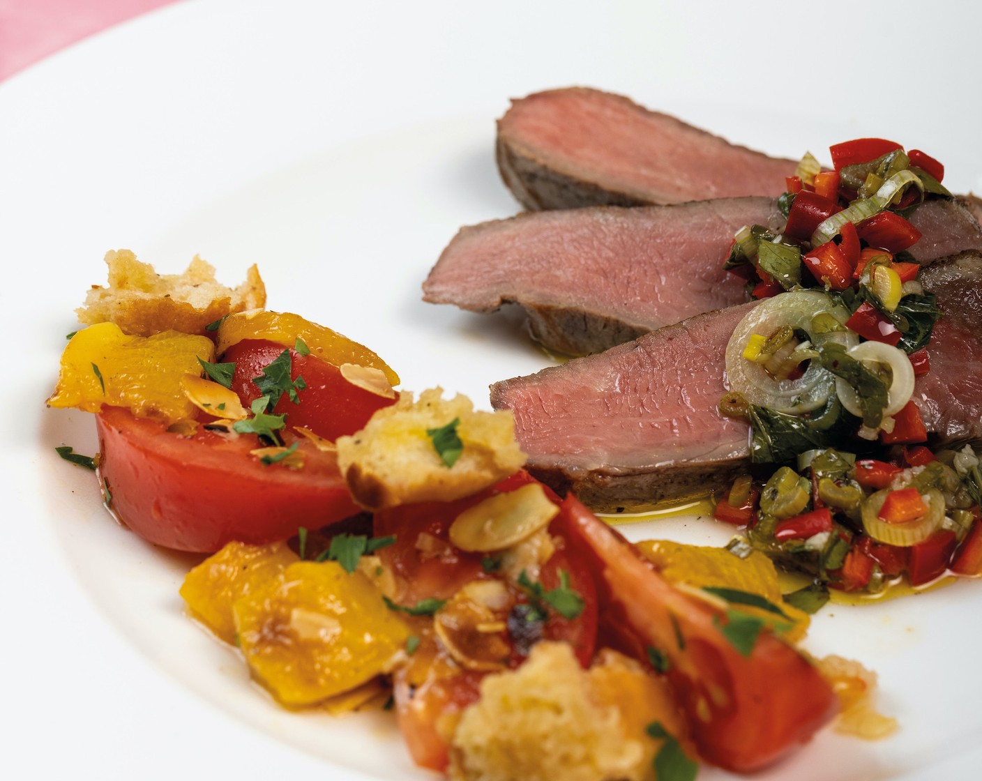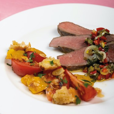 Doppeltes Entrecote mit Chili-Salsa und mediterranem Brotsalat