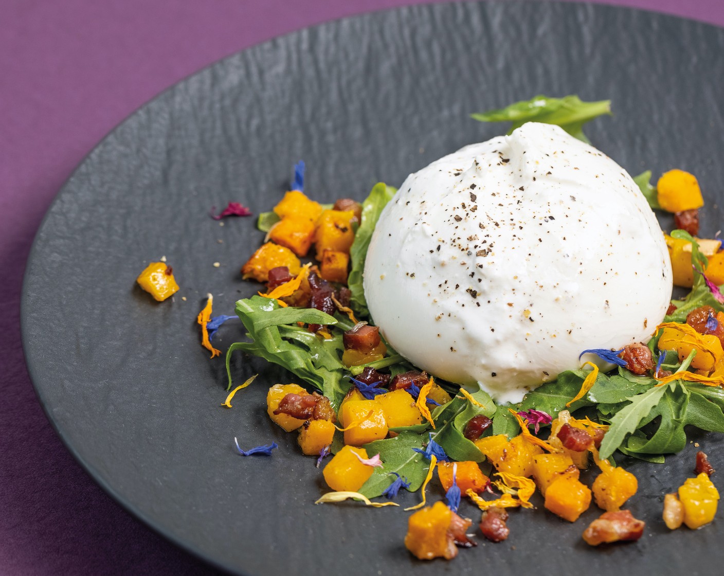 Diese Vorspeise wenn immer möglich auf einem dunkeln Teller anrichten. Um einen Kontrast zwischen warm und kalt herzustellen, bäckt man die Kürbismischung erst kurz vor dem Servieren.