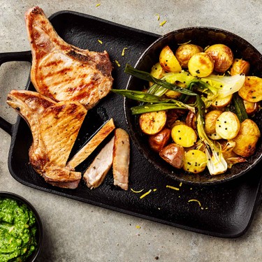 Zitronenkartoffeln mit Schweinesteak und selbstgemachten Spinat-Pesto.