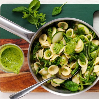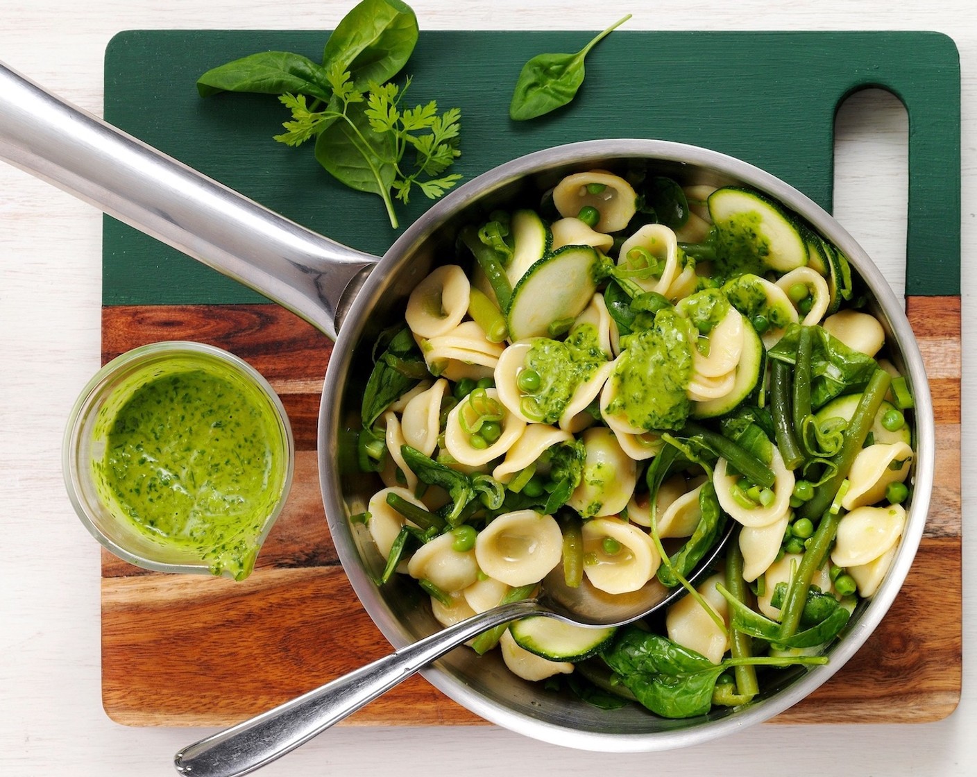 Eintopf mit Orecchiette, Bohnen, Zucchetti, Frühlingszwiebeln, Erbsen und Spinat, aromatisiert mit Kräutern, Knoblauch, Olivenöl und Gemüsebouillon.