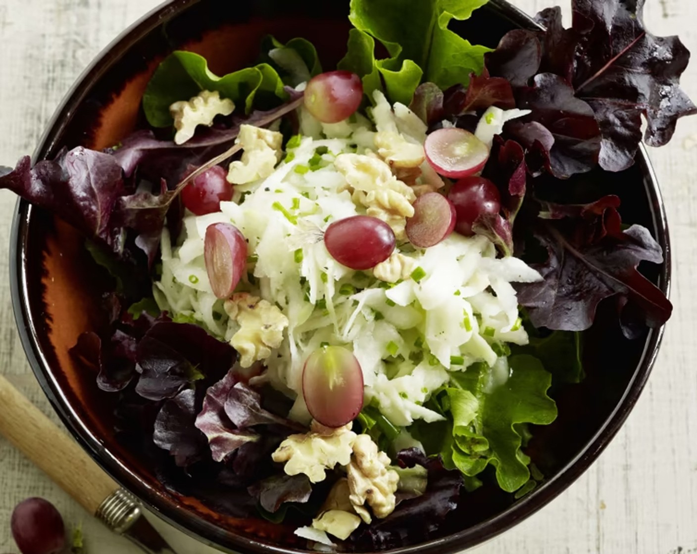 Kohlrabi-Raffelsalat mit Trauben und Baumnüssen: Eine schnelle Beilage oder kleine Mahlzeit.