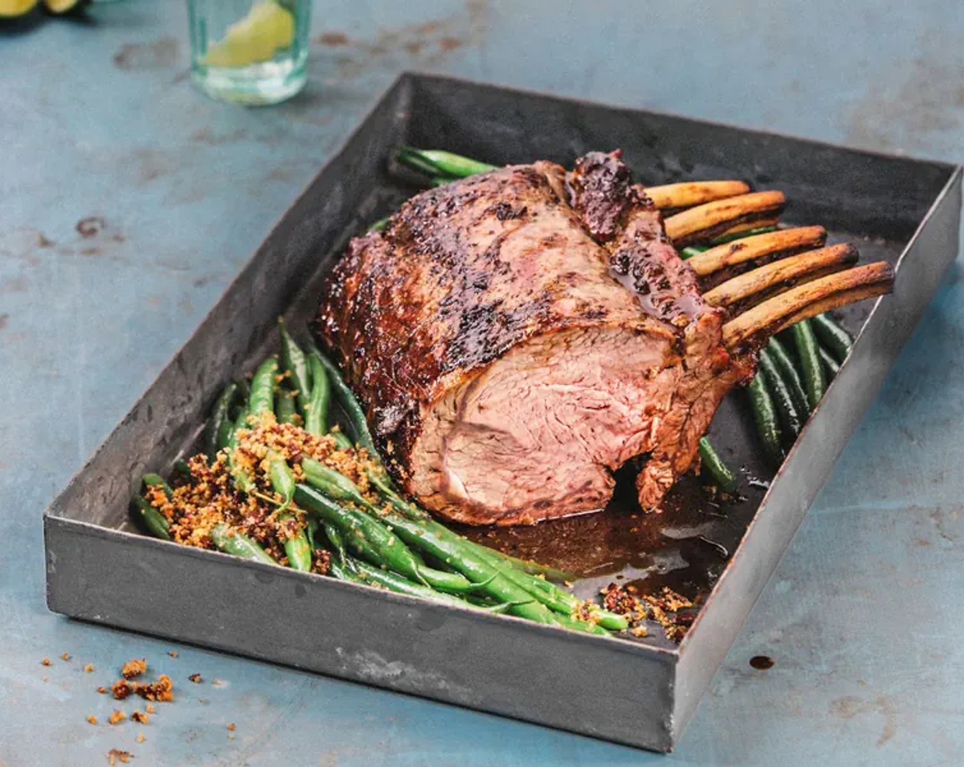 Ein grosses Kalbsrack – etwa zwei Kilogramm schwer – vom Grill ist ein saftiges Fleischvergnügen. Grüne Bohnen mit Speck passen perfekt dazu.