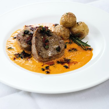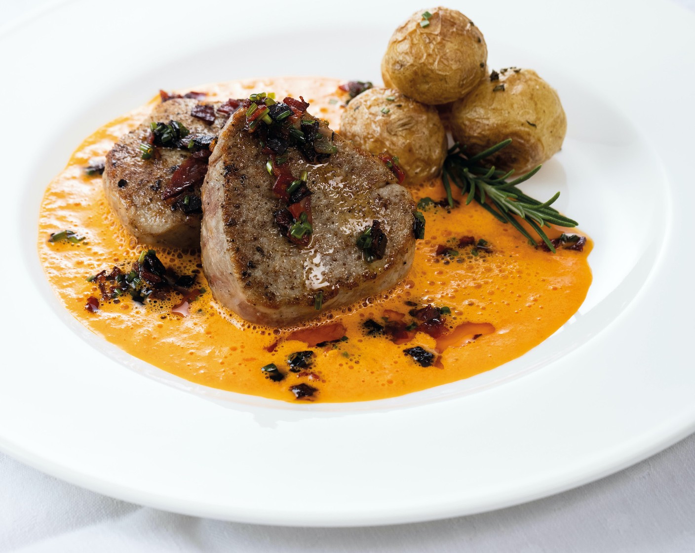 Die Kalbsfiletmedaillons kommen in dieser leuchtenden Peperonischaum-Sauce toll zur Geltung. Nicht nur für das Auge, auch für den Geschmack.