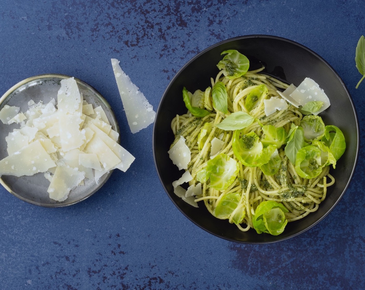Rosenkohl in einzelnen Blättern bzw. fein geschnitten passt prima zu Pasta. Etwa zu Spaghetti mit einem Pesto aus Basilikum, Öl, Knoblauch und Sbrinz.