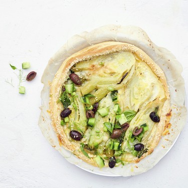 Der selbstgemachte Mürbeteig macht die Fenchel-Tarte besonders fein. Nach dem Backen daraufgegebene Gurkenwürfelchen und Oliven sorgen für eine frische Note.