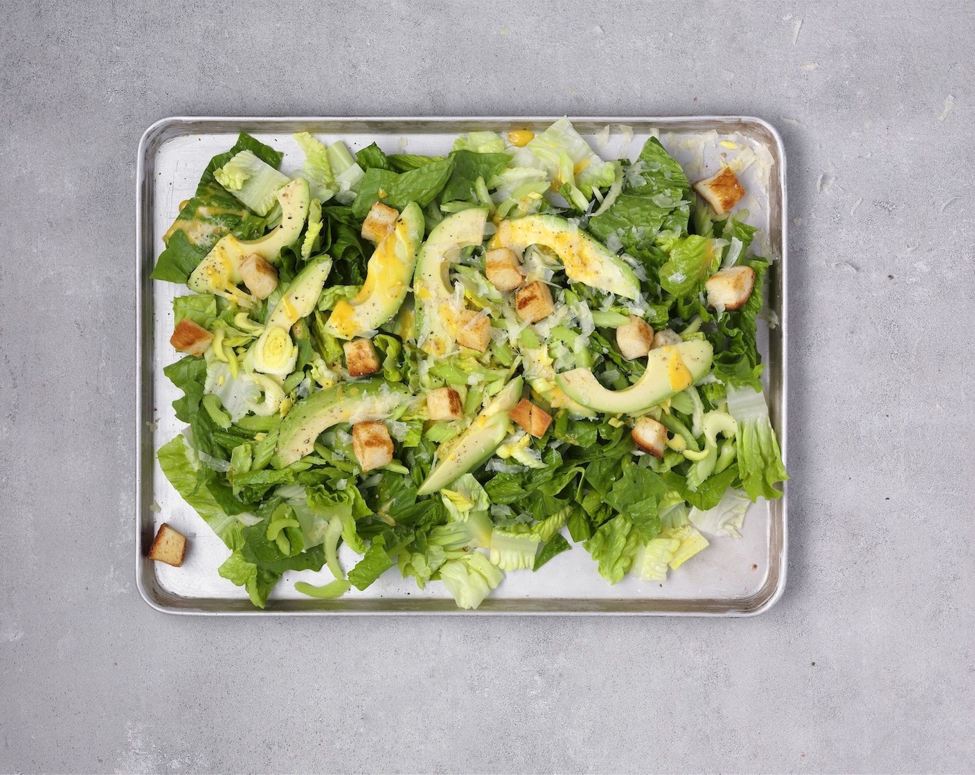 Diese Caesar-Salad-Variante erfreut mit Lattich, Stangensellerie, Avocado, Sbrinz und Croûtons. Mit gebratener Pouletbrust wird der Salat zum Hauptgericht.Salatdressing