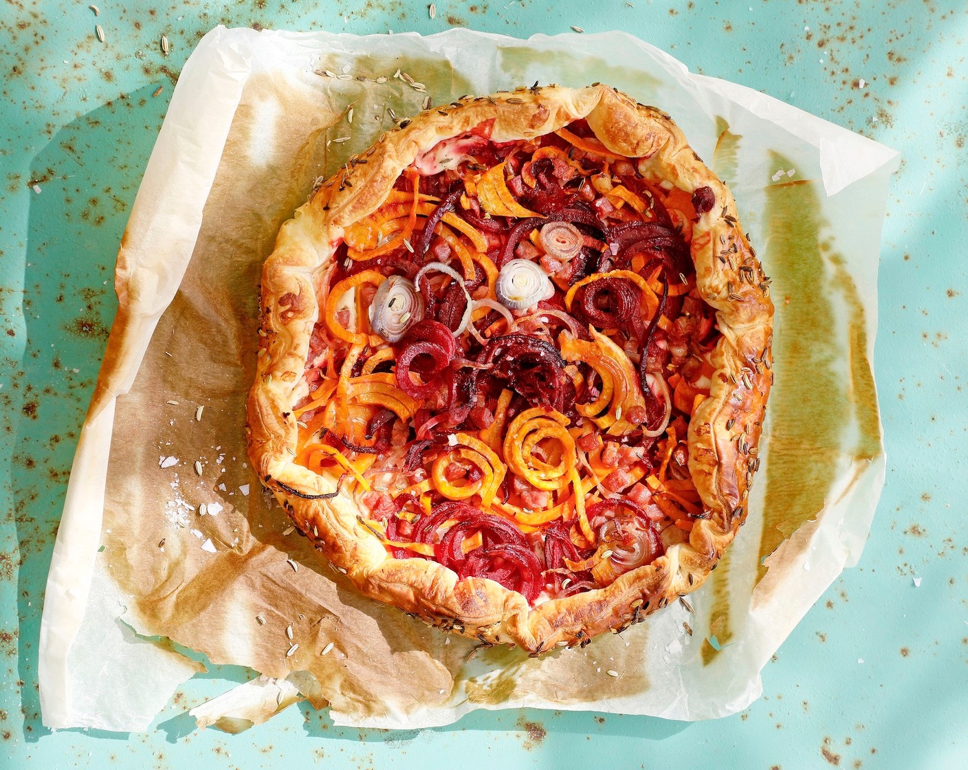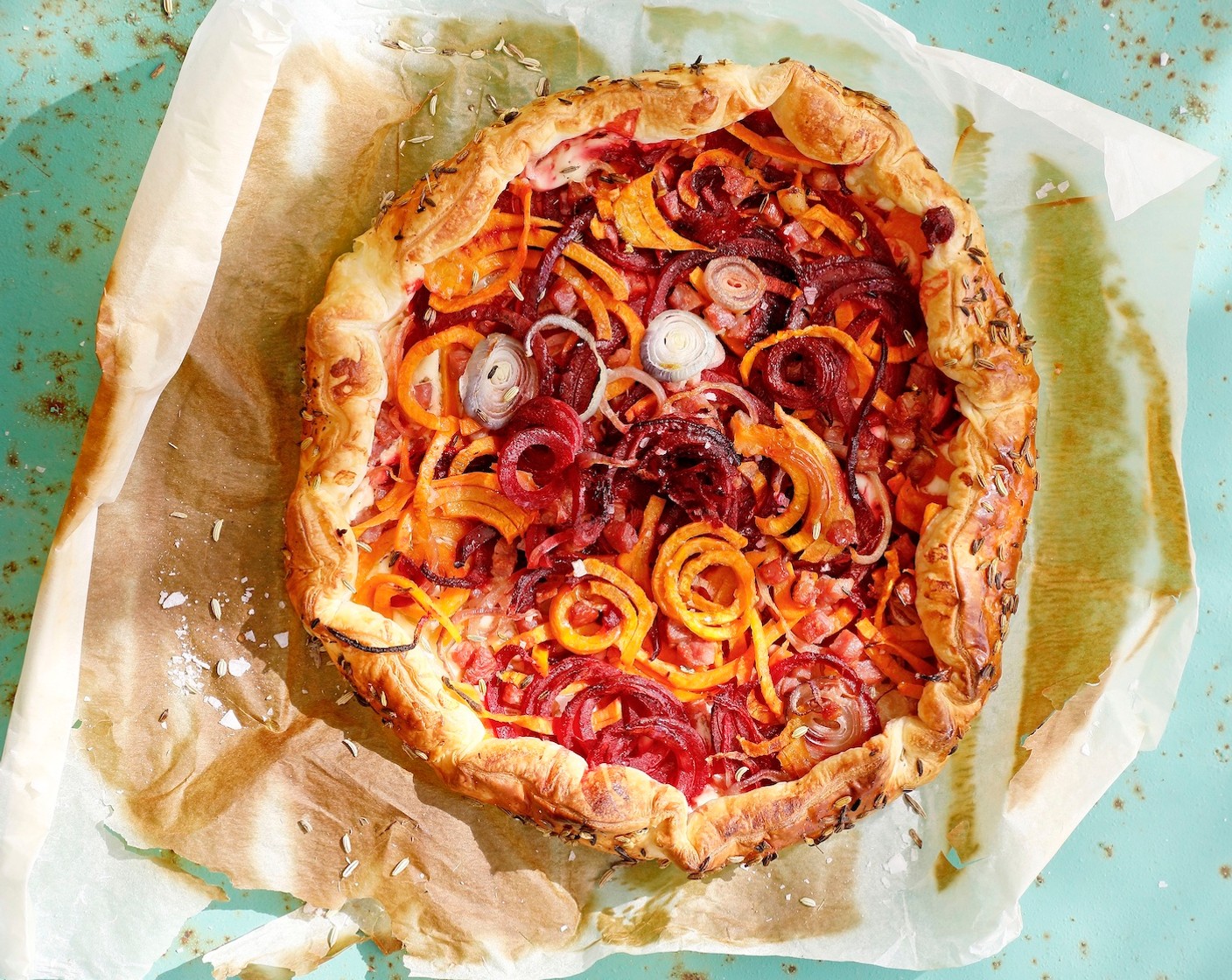 Blätterteigkuchen mit Wow-Effekt: Gemüsespiralen aus Randen und Süsskartoffeln, knuspriger Teigrand mit Fenchelsamen und herzhafte Speckwürfeli.