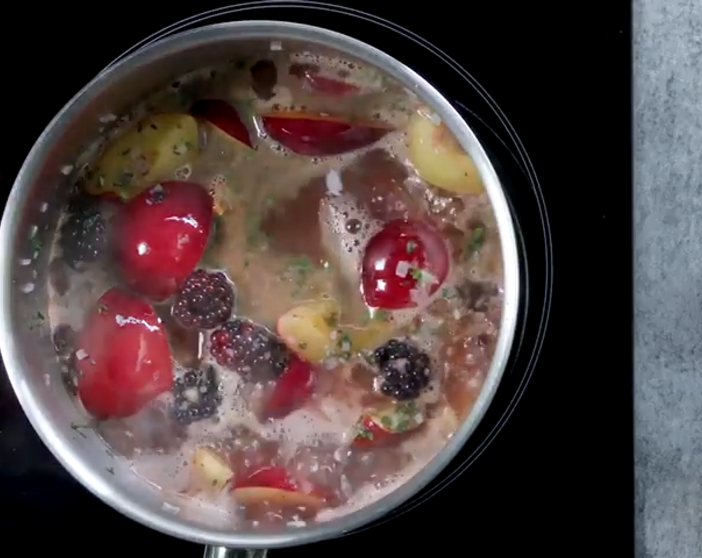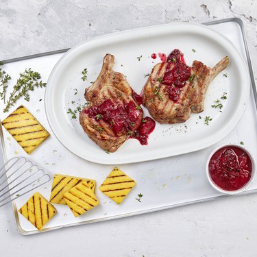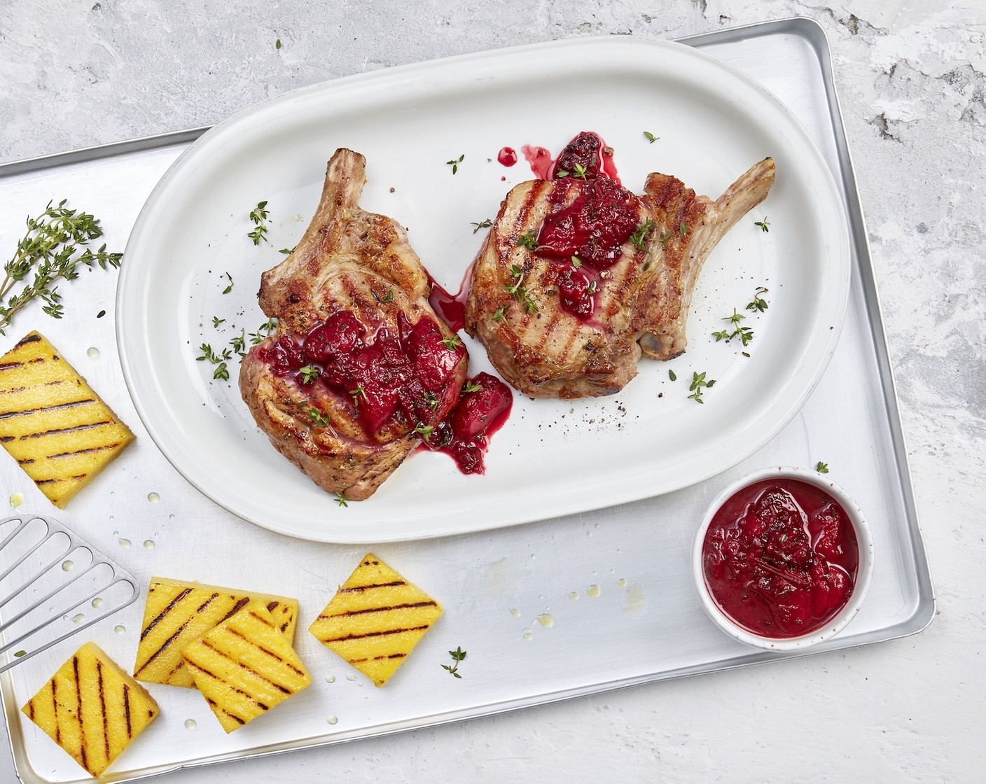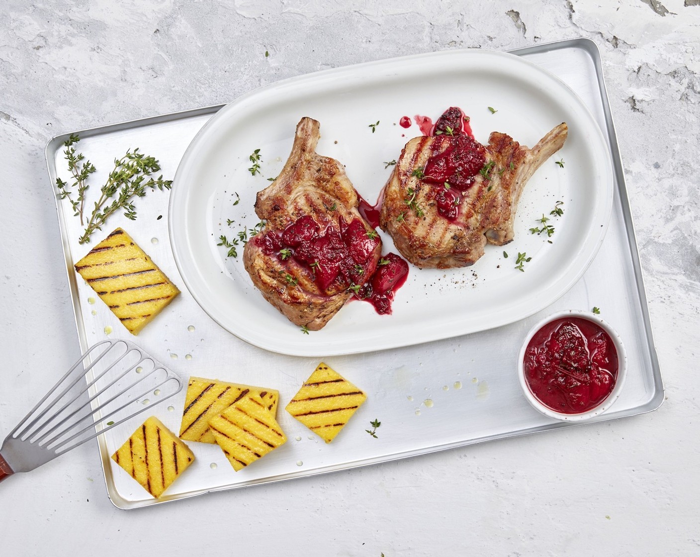 Das Fleischgericht begeistert auch Gäste: Die Pflaumen-Brombeer-Sauce zu den Kalbskoteletts vom Grill wird mit Schalotten, Thymian und Portwein zubereitet.