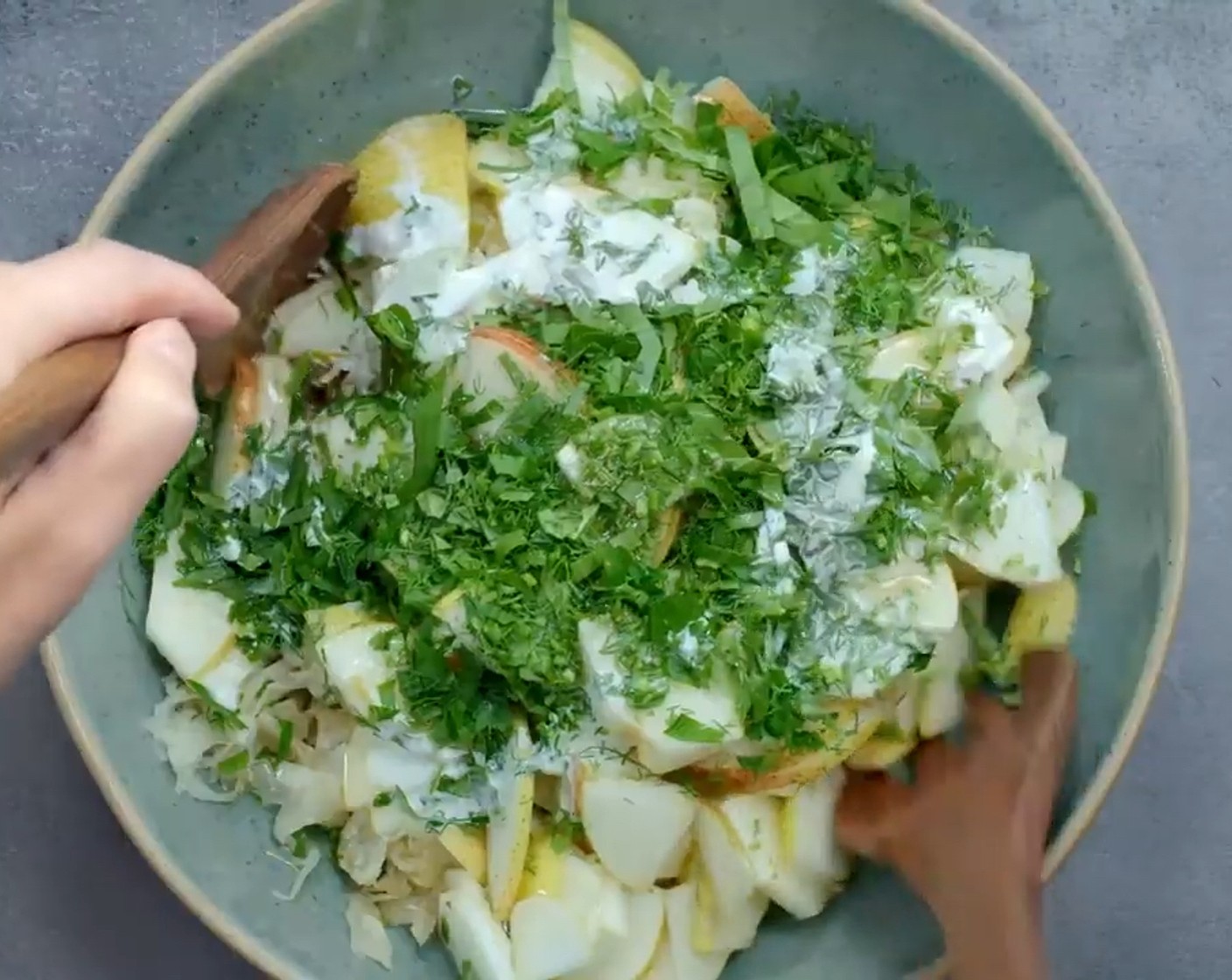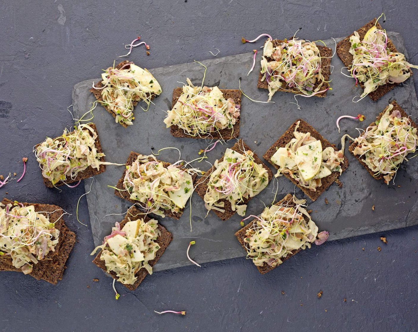 Wunderbare Kombi von Säure und Süsse: Der Sauerkrautsalat mit Birnen und Pancetta. Drapiert auf dunklem Brot macht er sich auch gut zum Apéro.