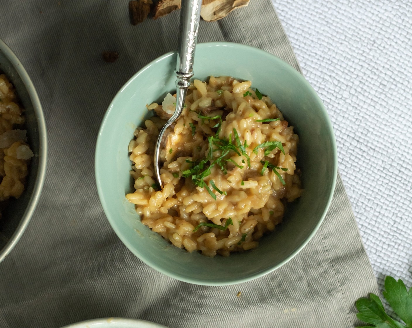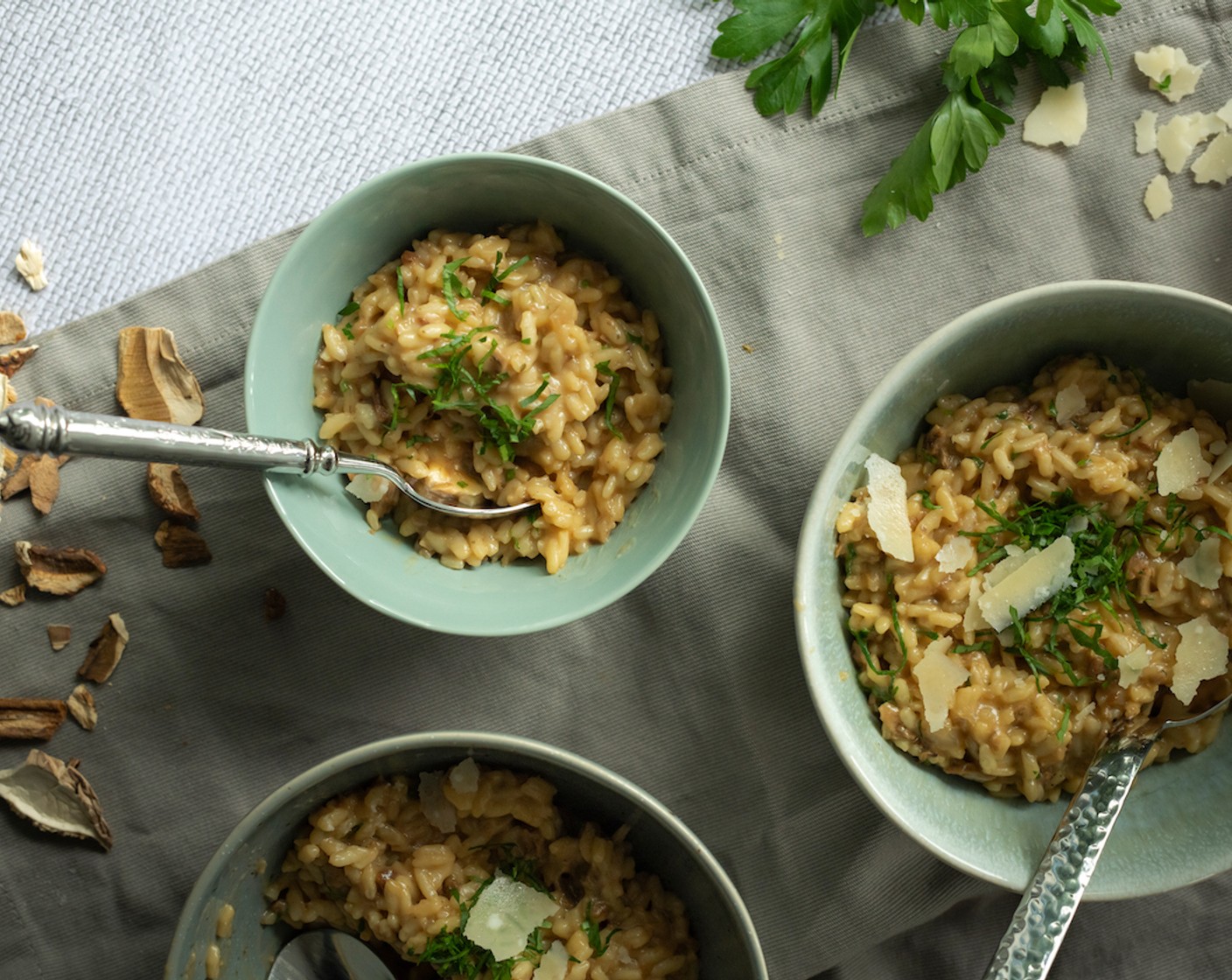 Was gibt es Besseres als ein duftendes Steinpilzrisotto an einem kühlen Herbsttag? Mit getrockneten Steinpilzen kannst du diesen Genuss für das ganze Jahr konservieren. Dabei ist das Einweichen der Pilze gar nicht nötig. Ganz im Gegenteil – gibst du die getrockneten Pilze direkt dazu, hast du noch viel mehr Geschmack im Risotto. Nun musst du nur noch tüchtig Rühren, damit nichts anbrennt.
