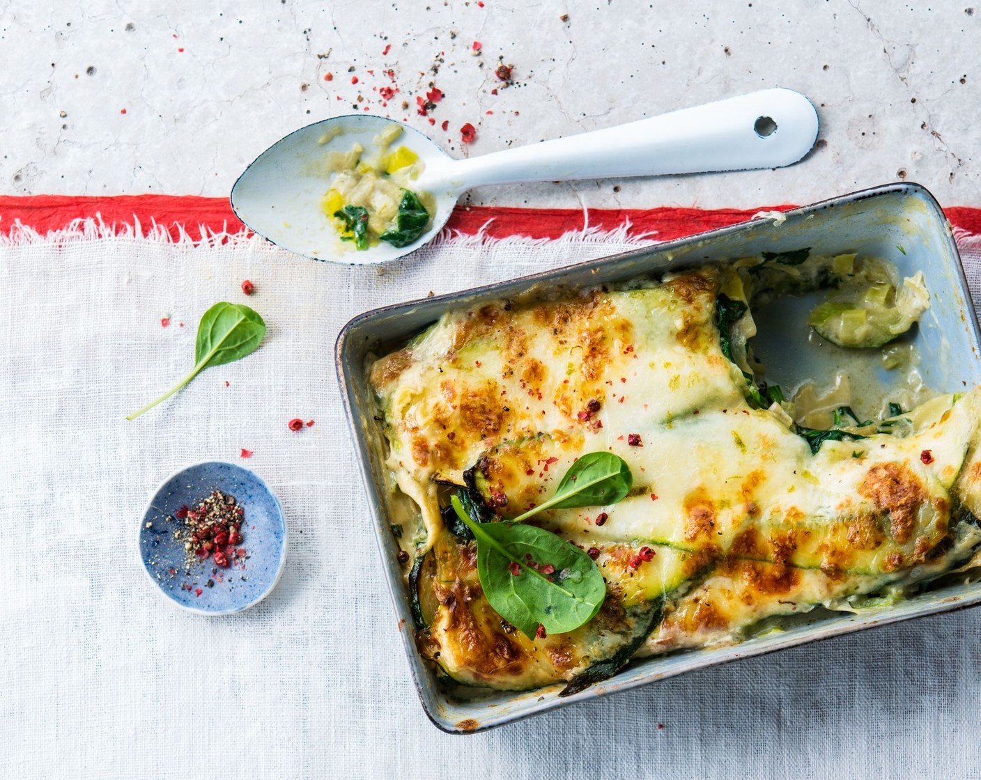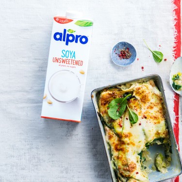Schnell gemachte Nudelschichten mit cremigem Gemüse und Alpro Sojadrink ohne Zucker.