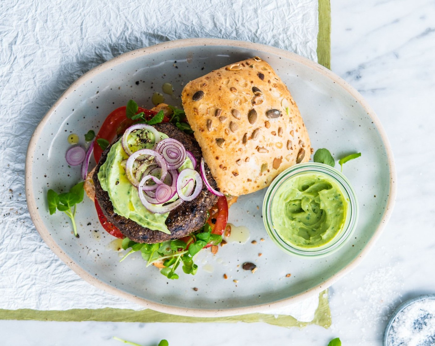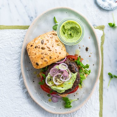 Pikante Burger mit dem Alpro Skyr Style Ohne Zucker. Dieses Rezept wurde gesponsert von Alpro.