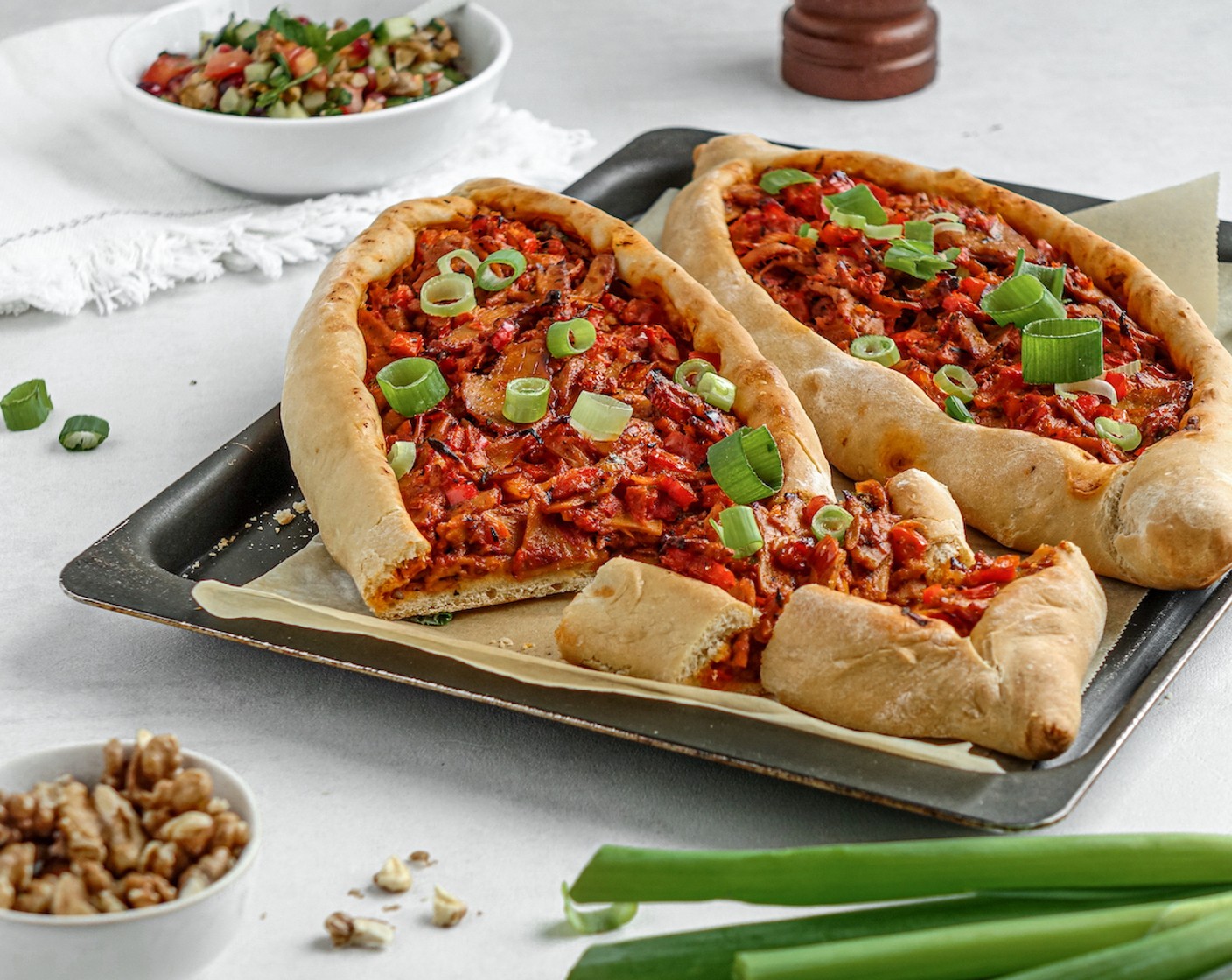 Unwiderstehliche plant-based Pide: Geniesse den einzigartigen Geschmack der würzigen planted.kebab Füllung, verpackt in einem knusprigen Teig - das perfekte Gericht für jede Gelegenheit.