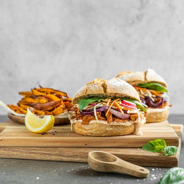 Power-Burger: Coleslaw Burger mit knusprigen Süsskartoffelpommes – das perfekte plant-based Gericht, für alle die es gerne frisch und lecker mögen.