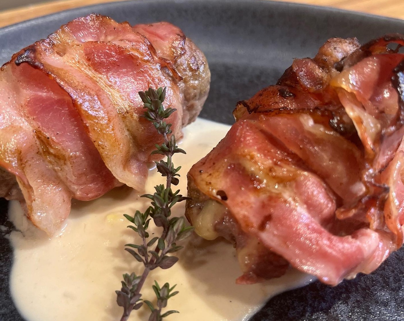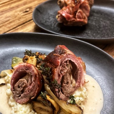 Saftplätzli gefüllt mit Champignons auf Weissweinsauce mit Käse im Speckmantel