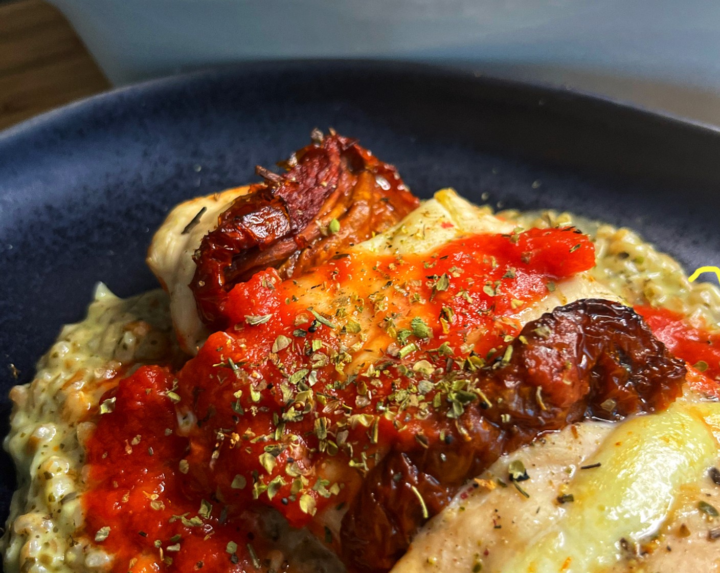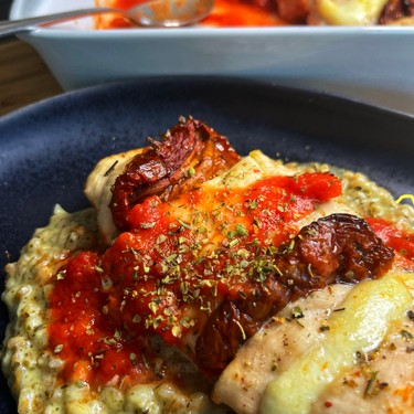 Gefüllte Pouletbrüstchen auf Basilikum-Kernotto