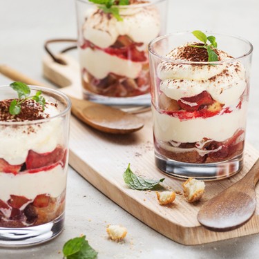 Ein super feines Dessert. Tiramisu mit köstlichem Kompott aus Rhabarber und Mascarponecrème. Hübsch im Glas serviert. Deine Gäste werden es lieben.