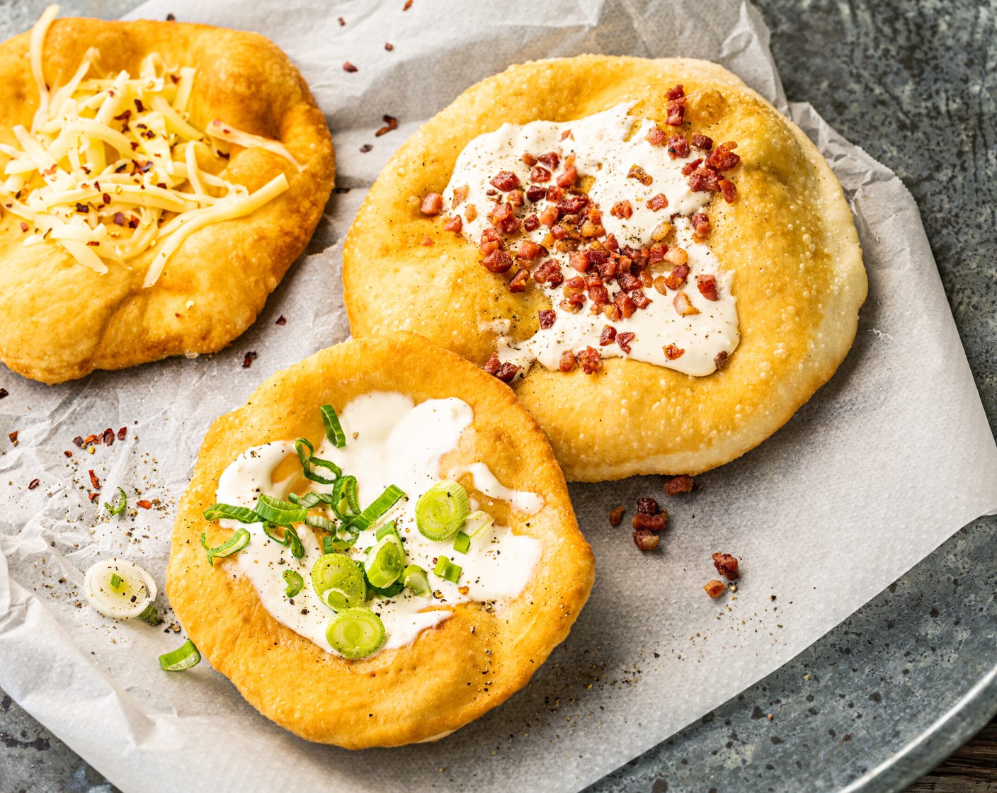 Langos ist ungarisches Streetfood. Der Hefeteig wird frittiert oder im Ofen gebacken und anschliessend mit Knoblauchsauce, Speck oder Käse belegt.
