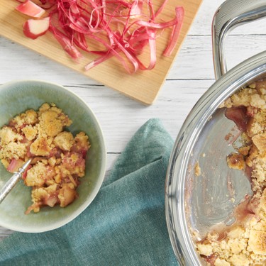 Wenn es um Rezepte geht, die so richtig nach Frühling schmecken, dann gehören solche mit Rhabarber unbedingt dazu. Frischer Rhabarber, der botanisch gesehen eigentlich ein Gemüse ist, ist nur für eine kurze Zeit auf dem Markt erhältlich oder im eigenen Garten zu ernten, da die Rhabarberpflanze für eine gute Ernte in der nächsten Saison eine lange Regeneration benötigt. Rhabarber hat eine sehr kurze Garzeit, deshalb ist er besonders gut für einen Crumble geeignet. Hast du gewusst, dass du den Crumble mit dem AMC Premium Kochsystem und dem Navigenio direkt im Topf zubereiten kannst?