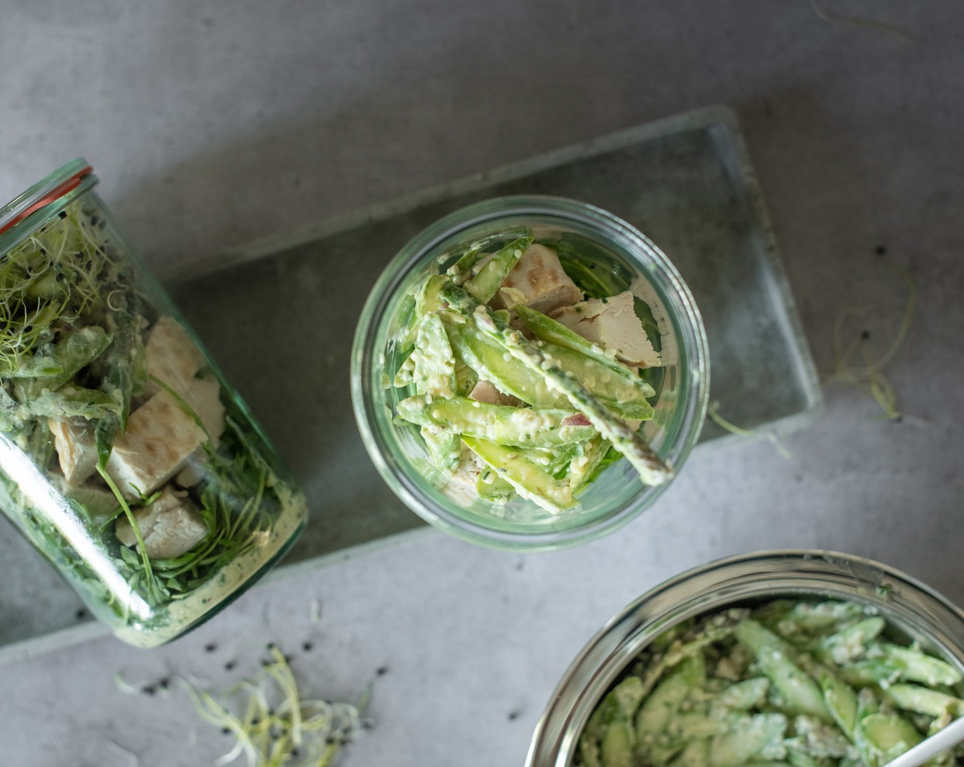 Viele Gemüsesorten sind heutzutage rund um das Jahr am Markt erhältlich, Spargeln – egal ob weisse oder grüne Spargeln – zählen eindeutig nicht dazu. Feine neue Rezepte dazu sind deshalb im Mai und Juni ganz besonders gefragt. Spargeln gibt es gekocht, gedämpft und gebraten oder gegrillt. Rezepte, in denen er roh verwendet wird, sind aber eher selten. In unserem Rezept wird der rohe Spargelsalat mit einer gebratenen Pouletbrust kombiniert und in einem Weck-Glas appetitlich serviert. Du findest, dass eine gebratene Pouletbrust zu trocken ist? Dann probiere unbedingt die Grillpfanne Arondo Grill aus dem AMC Premium Kochsystem aus. Damit kannst du die Pouletbrust ohne Zugabe von Fett kräftig anbraten und anschliessend zugedeckt auf der ausgeschalteten Kochstelle sanft gar ziehen lassen.