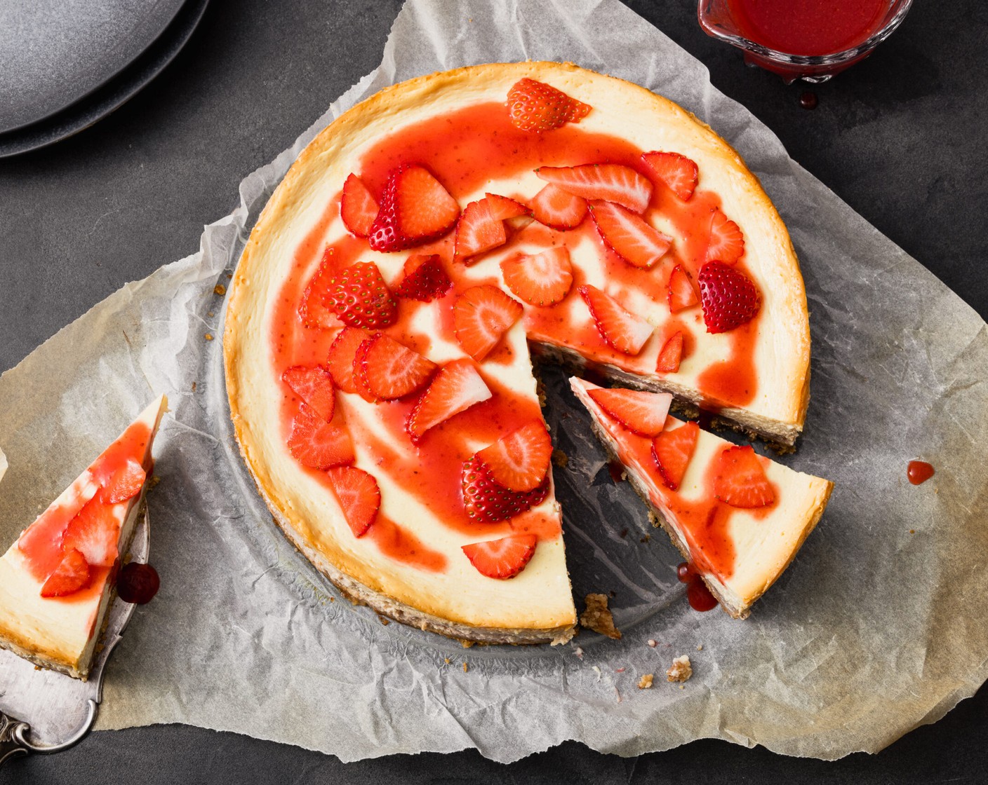 Der fruchtige Cheesecake mit dem knusprigen Boden, der cremigen Mitte und den süssen Erdbeeren als Topping ist ein köstliches Dessert für den Sommer.