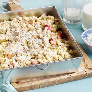 Rhabarber mit Streusel oder eben Crumble. Am besten lauwarm servieren. Dazu Vanilleglace, Schlagrahm oder Vanillecrème. Ein himmlisches Dessert!