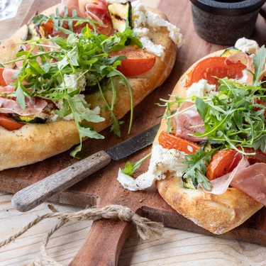 Pinsa ist eine herzhafte Foccacia. Ihr Teig ist besonders luftig-knusprig. Sie wird mit Zucchini, Tomaten, Rucola, Schinken oder Mozzarella belegt.