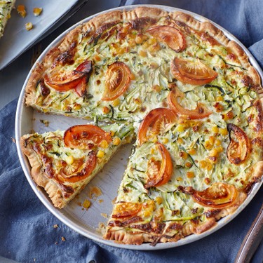 Wir belegen diesen köstlichen Gemüsekuchen mit Gruyère, Mais, Zucchini und Tomaten. Darüber einen leichten Wähenguss – einfach ein tolles Alltagsrezept.