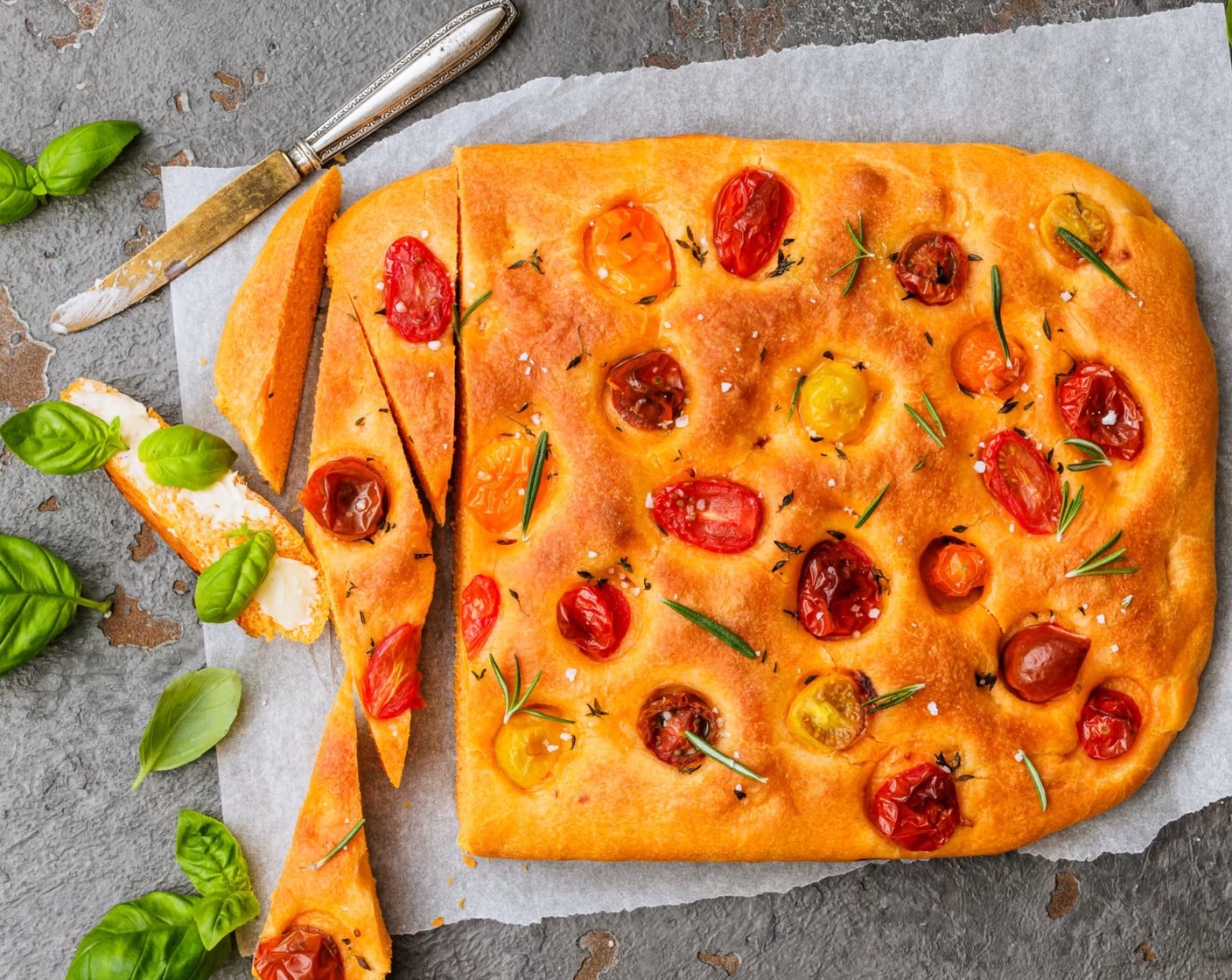 Diese Focaccia ist eine schöne Abwechslung zum Klassiker. Der Hefeteig wird mit Tomatenpüree angereichert und mit Tomaten und Rosmarin belegt.