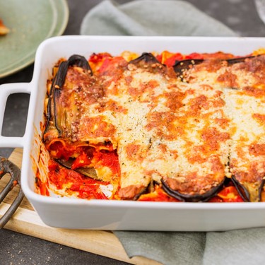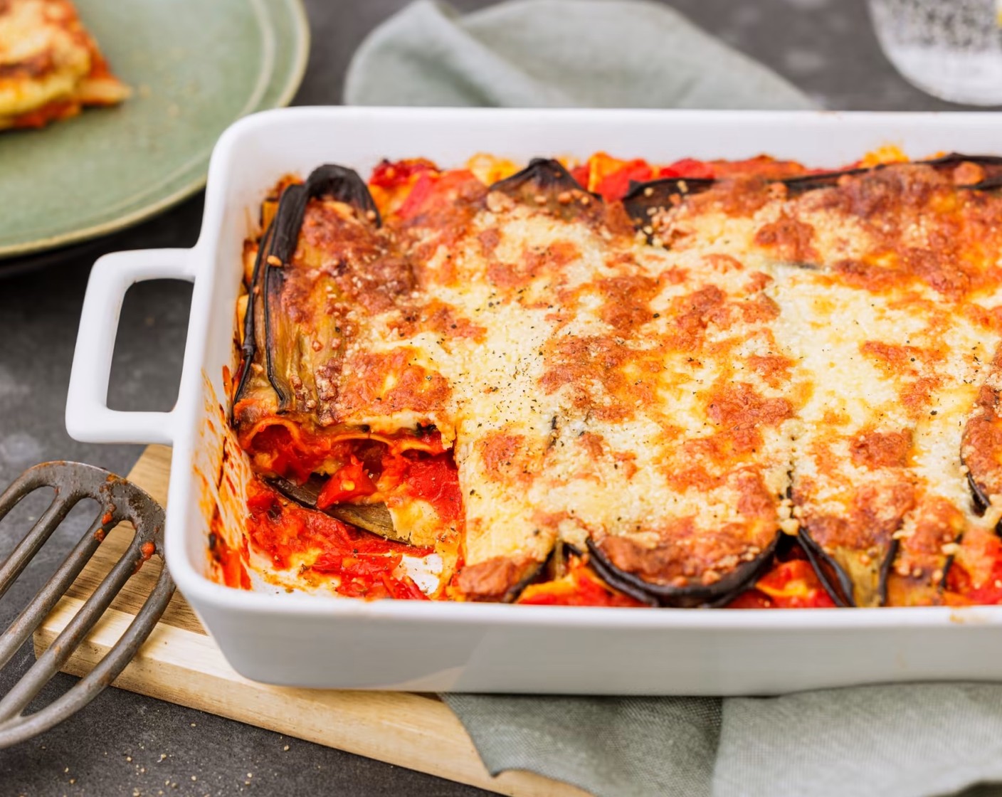 Lasagne mal anders. Schicht für Schicht wechseln sich gebackene Auberginenscheiben mit würziger Tomatensauce und Lasagneblätter ab. Ohne Béchamelsauce.