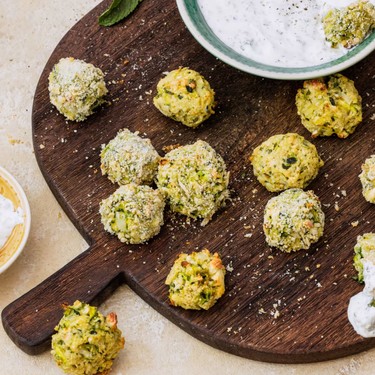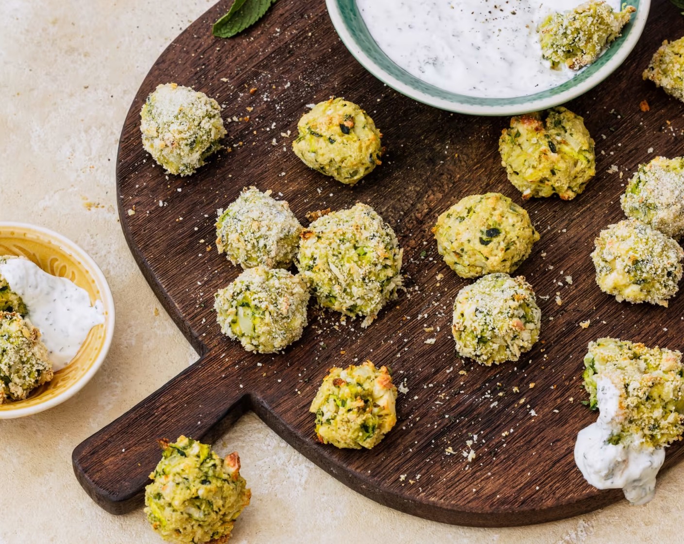 Diese für Griechenland typischen Keftedes, Bällchen, werden mit Zucchini und Feta zubereitet. Knusprig gebacken. Dazu gibts Joghurtsauce mit Minze.