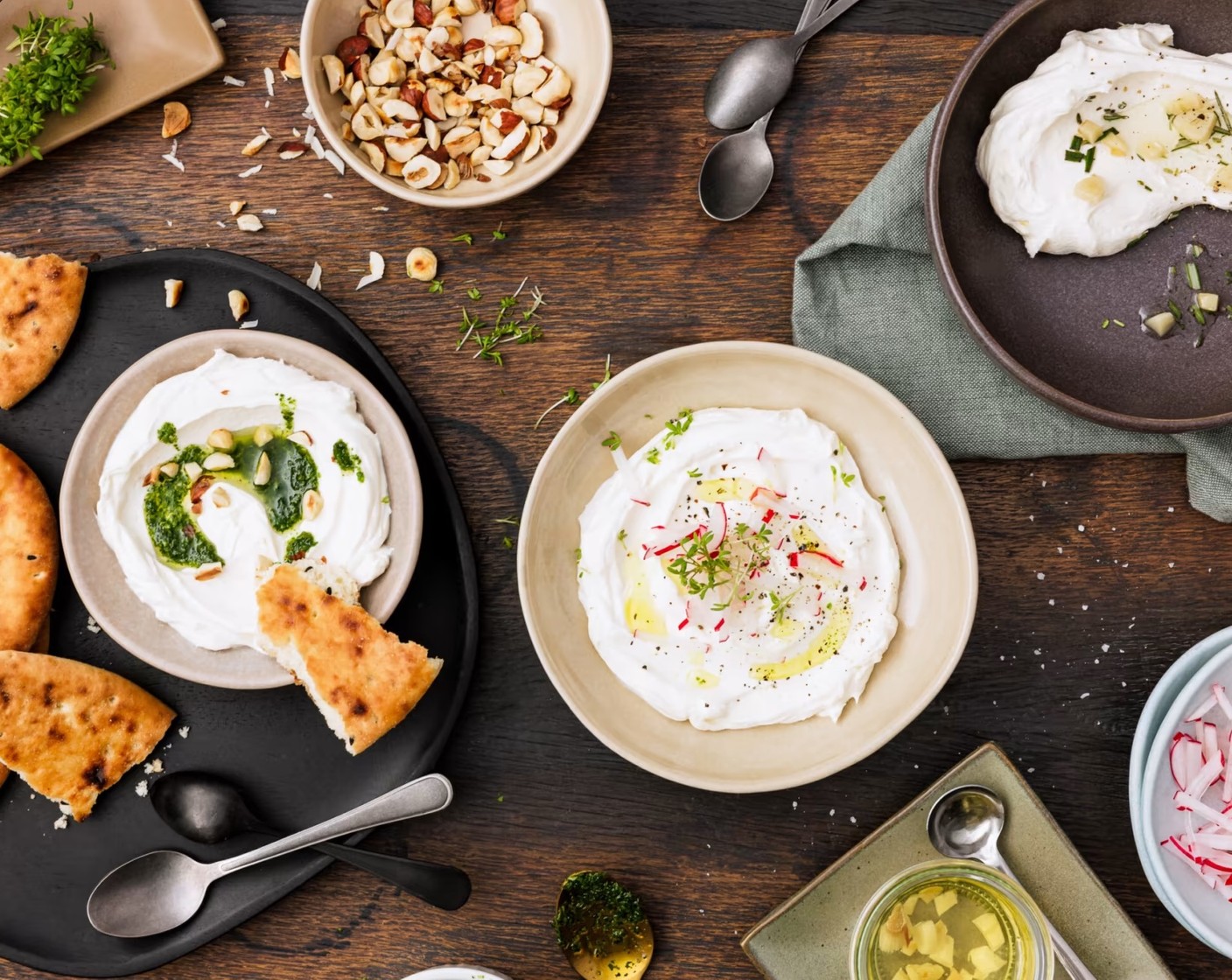 Den typisch libanesischen Dip kannst du einfach selber machen. Dieses Rezept zeigt dir die Herstellung von Labneh und drei würzige Toppings dazu.