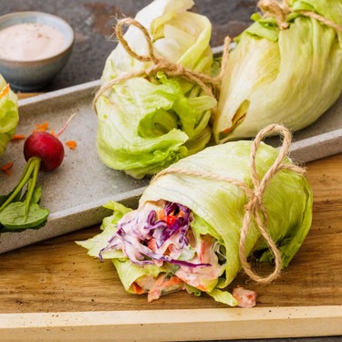 Low Carb, glutenfrei und fein: Die Blätter des Eisbergsalats dienen als Wrap. Sie werden mit Poulet, viel knackigem Gemüse und Sauce gefüllt.
