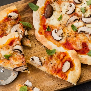 In dieser Pizza stecken viel Power und gute Proteine: Der Teig wird mit Magerquark angereichert und sie wird mit Mozzarella und Pilze belegt.