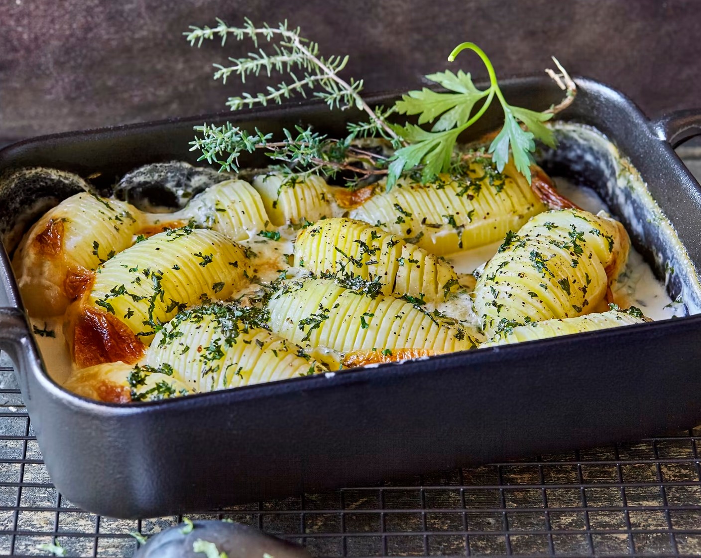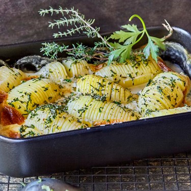 Ein Rezept für Ofenkartoffeln, die im Rahm mit Kräutern zubereitet werden. Beliebte Beilage bei Gross und Klein.