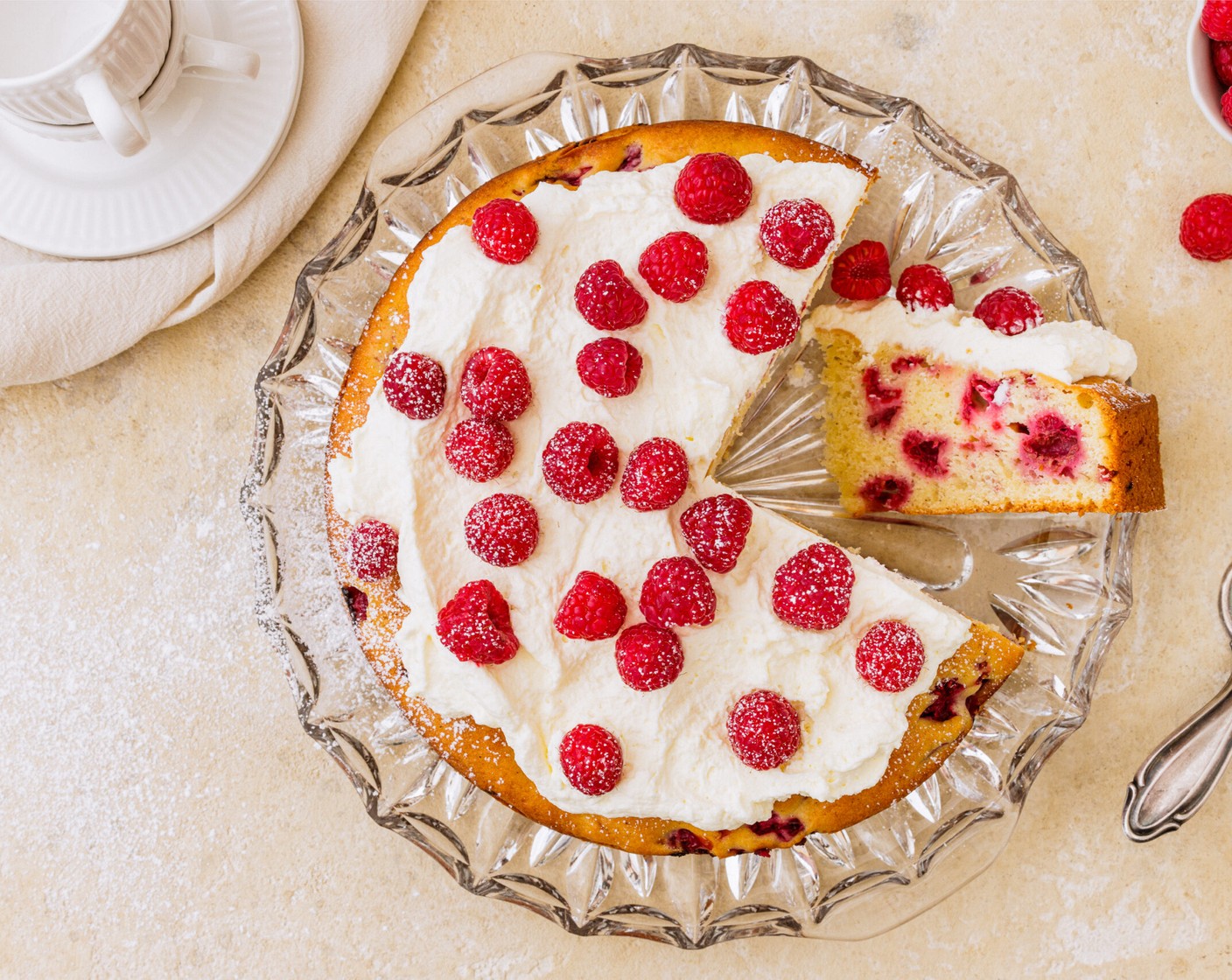 Dieser feine Kuchen ist superschnell gebacken. Der Rührteig bleibt dank Joghurt schön saftig, Himbeeren und Topping sorgen für fruchtigen Geschmack.