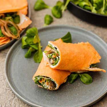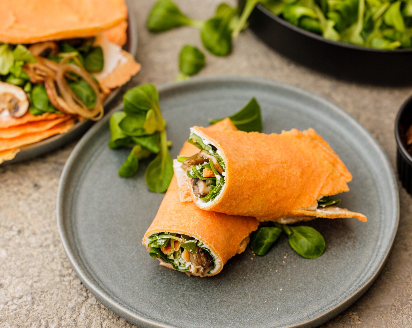 Die glutenfreien Wraps aus Linsen werden mit einer raffinierten Füllung aus Pilzen, Frischkäse und Nüsslisalat serviert. Sehr empfehlenswert.