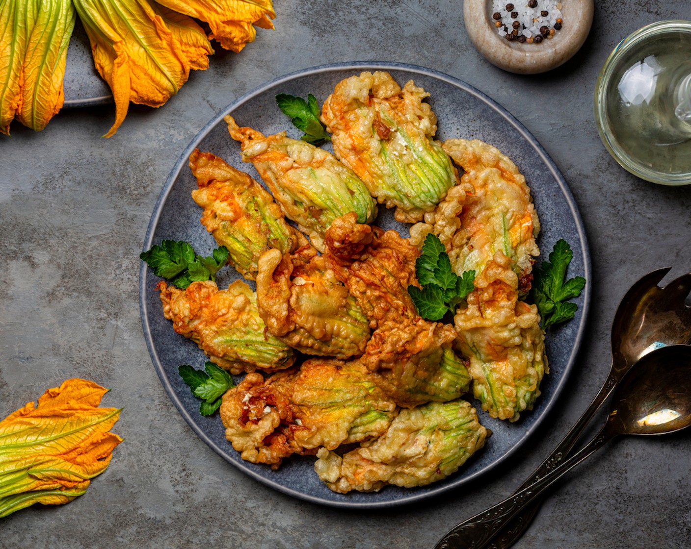 Zarte Kürbisblüten, gefüllt mit einer köstlichen Mischung aus Ziegenkäse und fein geraspelter Zucchini – dieses Gericht ist nicht nur optisch ein Highlight. Schmeckt warm oder kalt, perfekt als ausgefallene Vorspeise oder als Hingucker auf dem Büffet. Die knusprige Hülle und die cremige Füllung verschmelzen zu einem unwiderstehlichen Geschmackserlebnis mit einem Hauch mediterranem Flair.