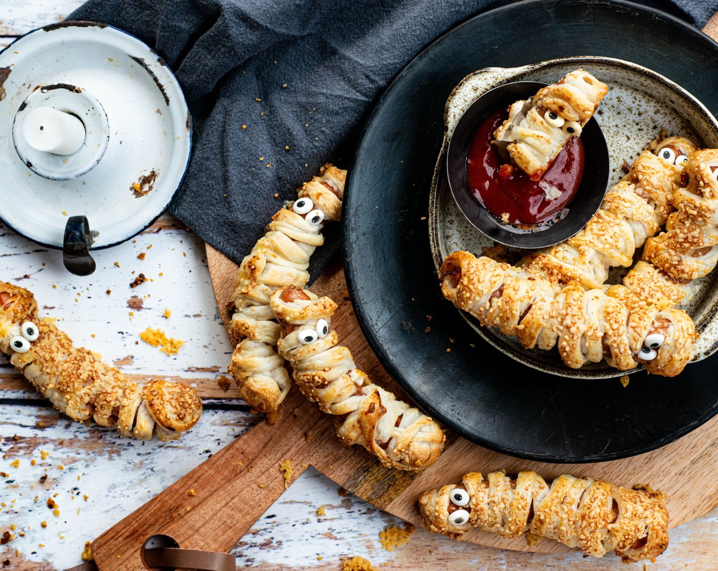 Herziges Halloween-Rezept: Wenn aus Wienerli im Teig mit Käse plötzlich Mumien-Würstchen werden, ist Spass bei Gross und Klein vorprogrammiert.