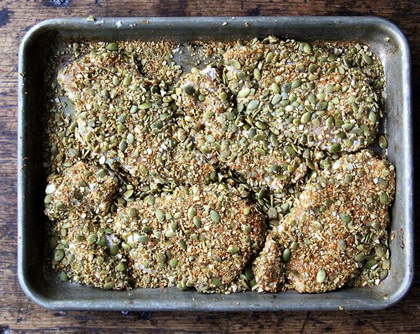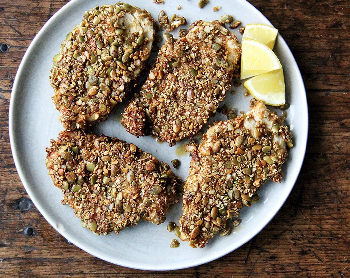 Auf der Suche nach einer aufregenden neuen Variante von panierten Hähnchenschnitzeln? Dann ist diese Version definitiv einen Versuch wert! Die Zugabe von Kreuzkümmel, Cayennepfeffer und geräuchertem Paprikapulver verleiht den gerösteten Kürbiskernen ein herrlich würziges Aroma und eine einzigartige Textur. Die Entscheidung, Samen anstelle von Semmelbröseln zu verwenden, macht dieses Gericht nicht nur für Menschen mit Glutenunverträglichkeit, sondern auch für diejenigen mit einer Nussallergie sicher.