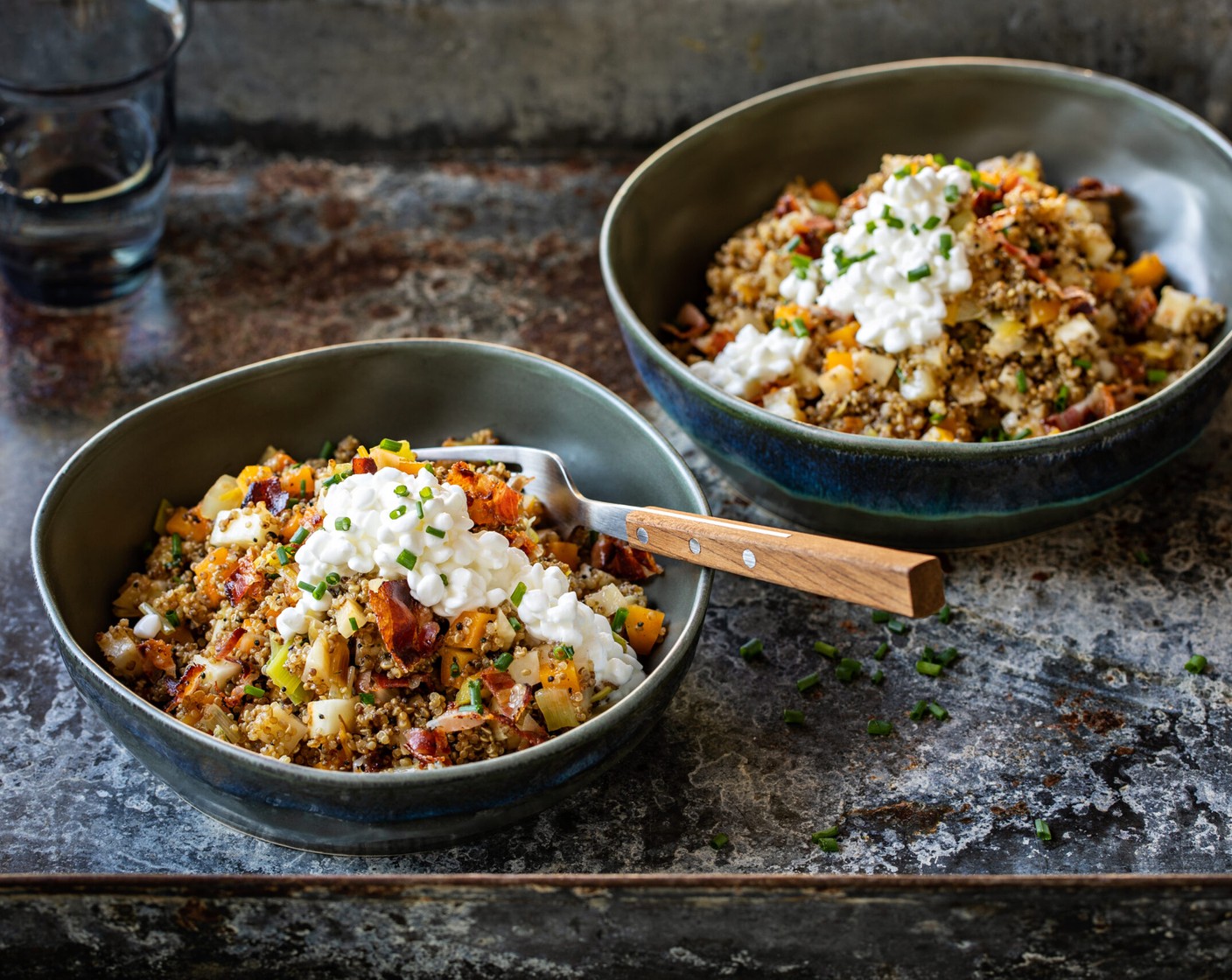 Raffinierten Quinoa-Salat mit Kürbis, Speck, Lauch und Sellerie an feinem Dressing und dazu Hüttenkäse.