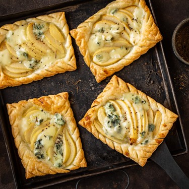 Köstlichen Jalousien aus Butter-Blätterteig mit Birnen und Blauschimmelkäse. Einfach und schnell gemacht.