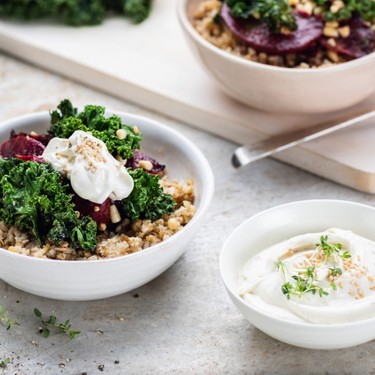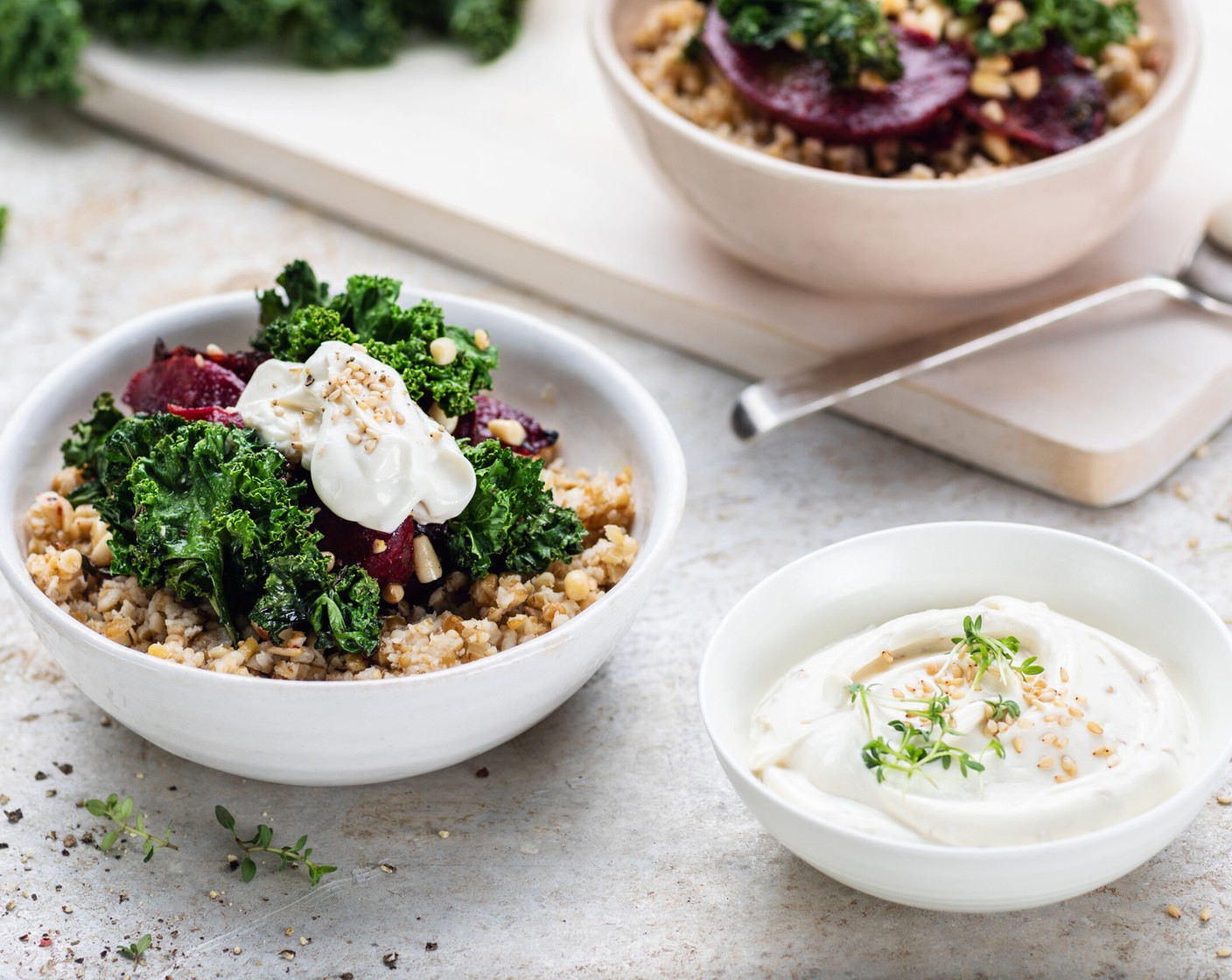Die Bulgur-Bowl für Herbst und Winter. Randen und Federkohl sind voller Mineralien und Vitamine. Bulgur und Schweizer Quark geben Energie. Purer Superfood.