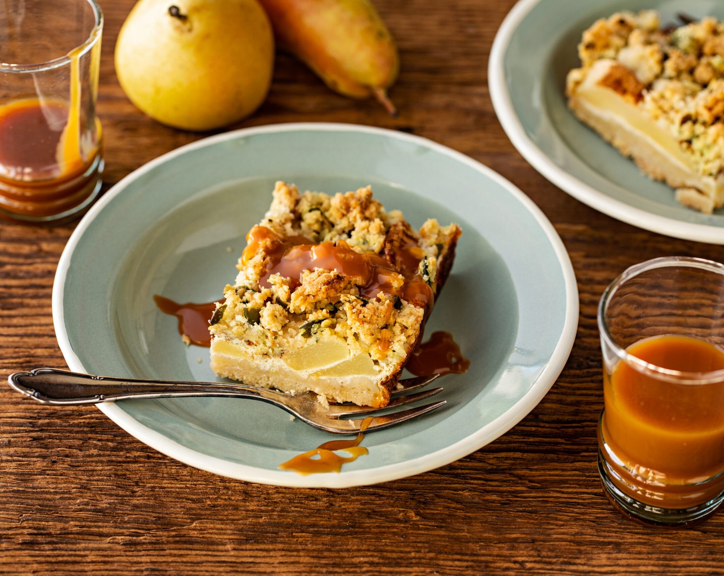 Feiner Streuselkuchen mit Quarkmasse und Birnen. Streusel und leicht gesalzene Caramelsauce sorgen für Hochgenuss.