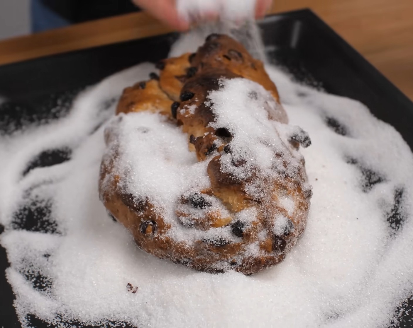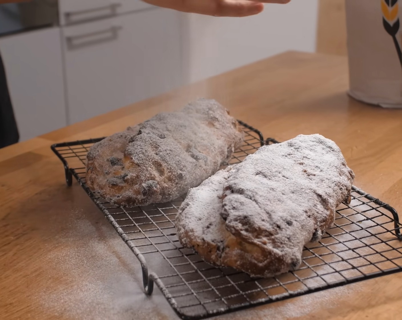 Zum Schluss die Stollen grosszügig mit Puderzucker (wenig) bestauben. Den fertigen Stollen 2–3 Stunden abstehen lassen. Nach etwa einer Woche anschneiden, um das volle Aroma zu geniessen.